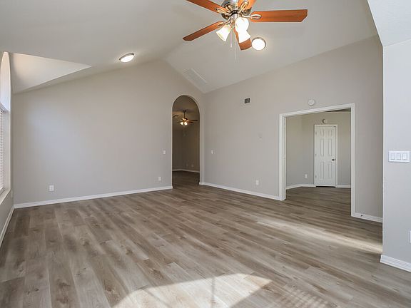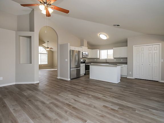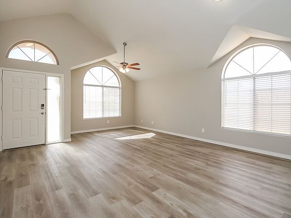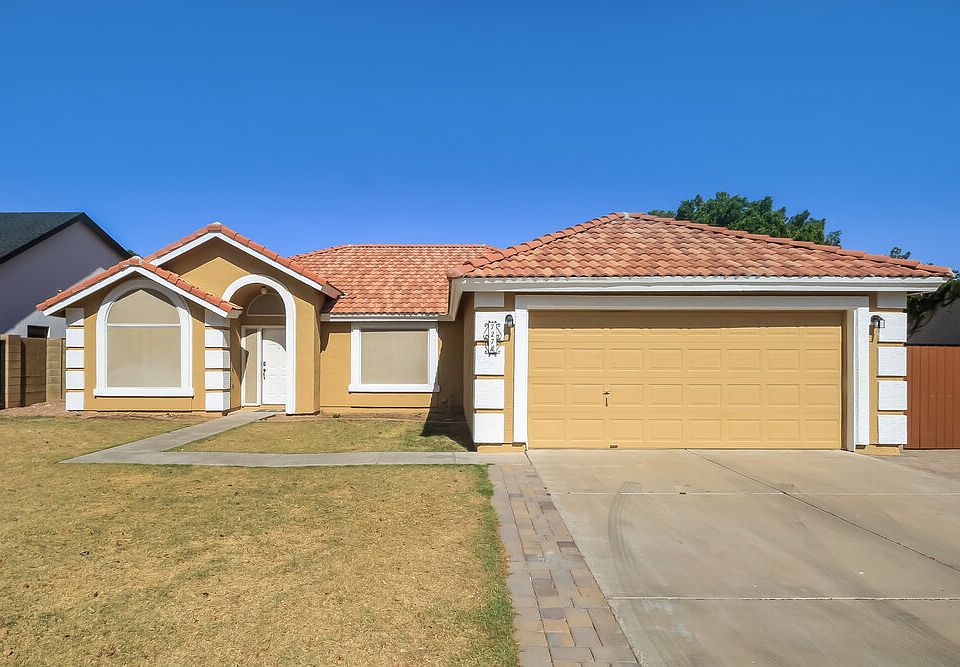 With a colorful exterior and an attached garage, this Mesa, AZ rental home offers great curb appeal. Inside, you'll find a 1,920-square-foot layout featuring four bedrooms and two bathrooms on a single level. Arched windows and an extra-high vaulted ceiling in the living room welcome you inside. Follow the charming arched doorway into the eat-in kitchen to find a big center island, modern appliances, and a good-sized breakfast nook with a pretty bay window. You'll love the primary suite's double-door entrance and wood-look flooring. Along with a private bathroom with a checkered tile shower, the suite includes a sizable walk-in closet. Head outside to relax on the covered back patio while your pets explore the safely-enclosed yard. Schedule your in-person tour today!