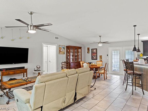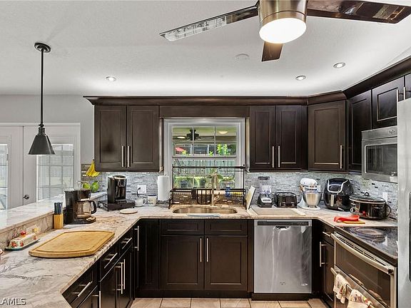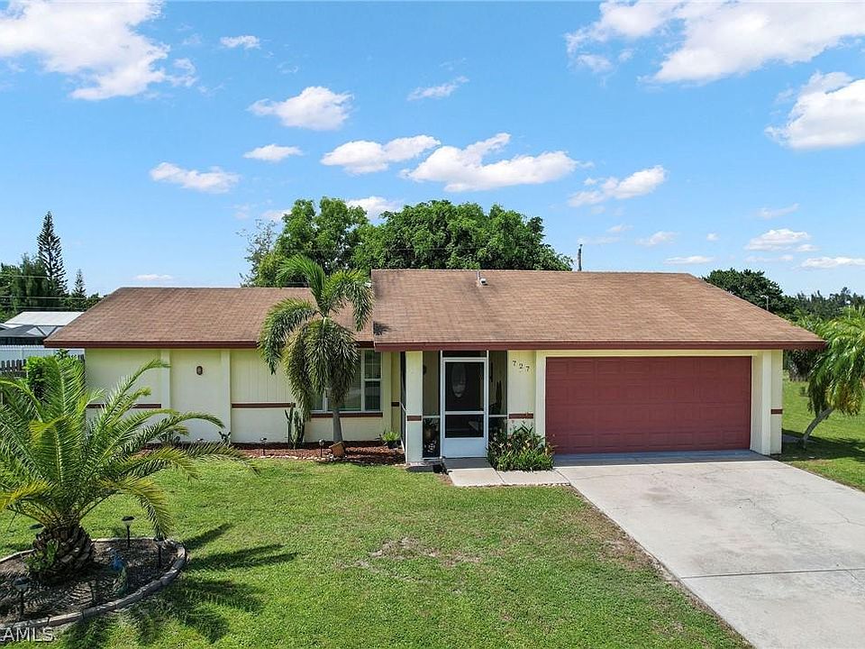 This 3 bedroom 2 Bath home is on City Water & Sewer & Assessments are PAID!! BRAND NEW ROOF being installed October 2022. Entering the home through the screened front porch you will be welcomed by the open floor plan with tile throughout the main living area & carpet in the bedrooms. The chefs kitchen has been updated with shaker cabinets, granite counter tops with a mosaic & stone backsplash, stainless steel appliances, and offers a breakfast bar, recessed lighting, giving you lots of counter space for food prepping or eating. The Primary bedroom is spacious and has an updated bathroom with walk in shower with beautiful tumbled travertine stone. Hurricane Impact rated garage door. A/C replaced in 2018. The back yard has an extended patio & is fully fenced for your 4 legged friend or for the kids to play freely with plenty of room to add a swimming pool. Home is wired already for a generator hook up & Outside storage shed has electric available. Great location just south of Pine Island Rd and close to shopping, dining, and restaurants.