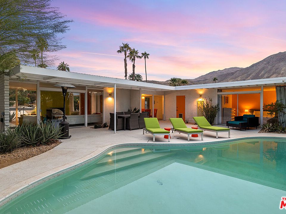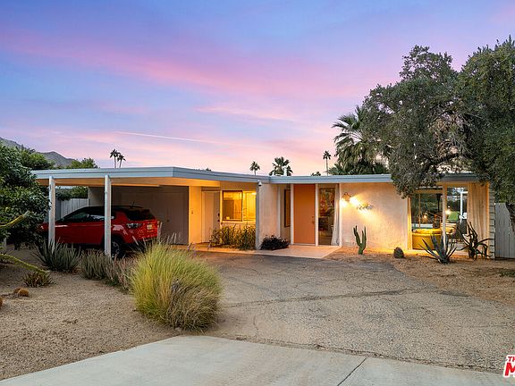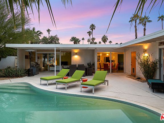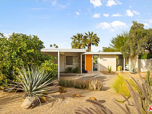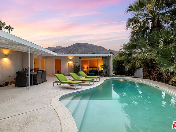 Exquisite Mid century modern home nestled in the heart of South Palm Desert. Designed by the renowned architect Ross Patton, whose illustrious work includes Frank Sinatra's "Villa Maggio" estate, this home is a testament to timeless elegance and architectural pedigree.With breathtaking and explosive mountain views and spanning 1,242 square feet, this stylish residence offers two bedrooms and two beautifully en suite updated bathrooms. The interior is bathed in natural light coming from the floor to ceiling windows, highlighting the stunning "Heath tile" fireplace and the sleek, concrete floors. The open layout seamlessly integrates indoor and outdoor living, inviting you to enjoy the serene desert ambiance. Step outside to discover your private oasis on a generous 7,405 square foot lot. The sparkling heated pool, is perfect for leisurely swims or poolside lounging on manicured grounds with palm trees, palo verdes, and low maintenance desert landscaping. An outdoor bed platform offers a unique space for relaxation under the sun or stars. The property also includes convenient amenities such as laundry facilities within the building and covered parking.Recent upgrades ensure modern comfort with tasteful bathroom enhancements. With its uber-cool location, just moments from El Paseo, Whole Foods, Trader Joe's, and scenic hiking trails, this home is a rare gem that promises an unparalleled lifestyle. Experience the allure of mid-century design and make this architectural treasure your own. No HOA's!