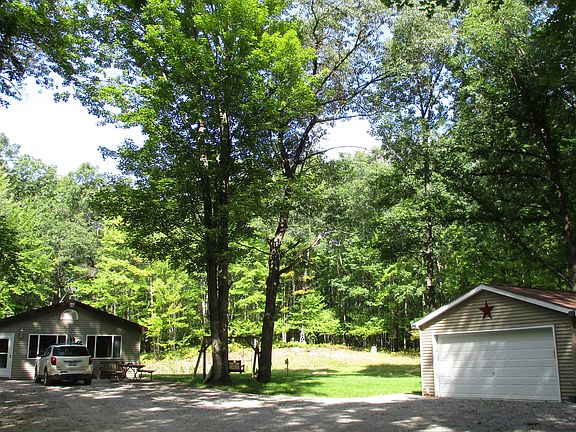 Enjoy summer (and all the seasons) in this turnkey ranch home in the woods with 10 acres of land. Two bedrooms and a smaller room (with closet) that can be a bedroom or den; 2 baths; lots of windows overlooking woods and pond, yet only four miles from town. Two year old forced air furnace (propane) with pellet stove for extra comfort. Plenty of wildlife and seclusion. Home is on school bus route so road plowed and maintained. Spectrum high speed cable and internet. Great tasting water. No softener needed. Detached 20 x 20 garage (built in 2017) along with a 10 x 12 shed for storage. Limestone driveway in great shape. Furnishings negotiable. No pets.