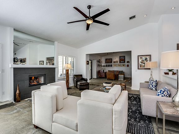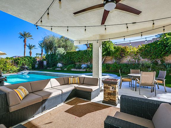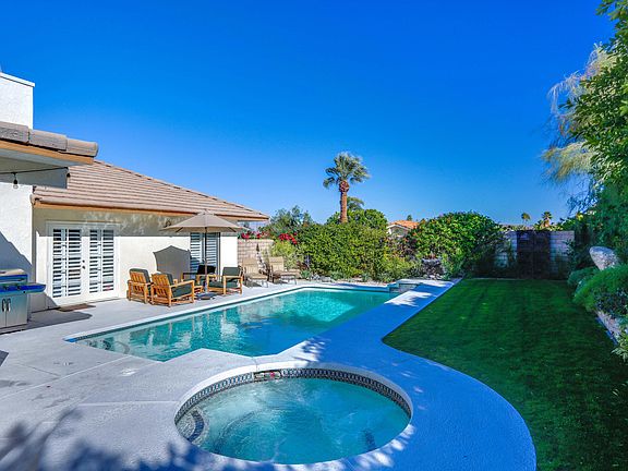 The perfect South Palm Desert home in a desirable location situated on an elevated corner lot. This 3 bed, 3 bath home has a beautiful south facing private backyard with large covered patio, pool, spa, plus mature, easy to maintain landscape that adds ambiance completed with lemon and grapefruit trees. The front entrance welcomes you with mountain views, an enclosed and gated courtyard for added privacy. The open floor plan offer a spacious living room with fireplace. Adjacent you will find a Family/TV room with bar and built in wine fridge. A renovated eat in kitchen features high end appliances, two peninsulas and a small island.for plenty of prep and entertaining space. The open concept layout extends to a spacious dining area. Two of the three bedrooms feature ensuite baths. The attached three car garage also adds space to this amazing property.