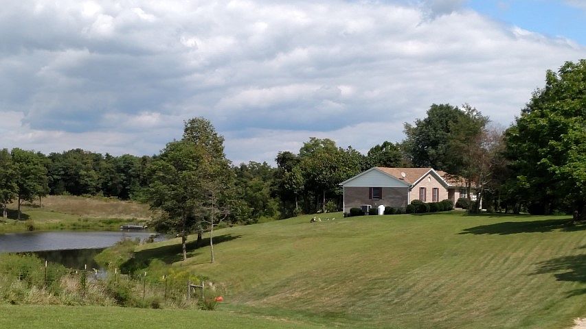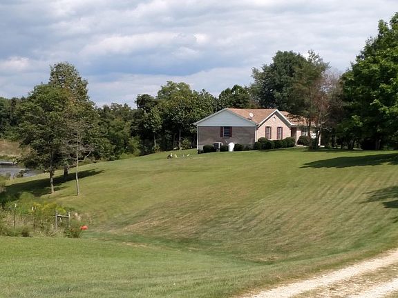 On a country lane is this 3 BR/2 BA brick ranch on a full, walkout, mostly finished basement, and 14 acres. The home features 2 FPs, master suite with his/hers closets, electric heat pump/central air, newer roof, 2-car garage, and a covered back patio with peaceful views. The land explodes with its scenic 2.5 acre stocked lake (including your own island), and a 30x50 pole barn with electric, water, and concrete floor. Also included are a 1 acre pasture area, garden area, and your own orchard.