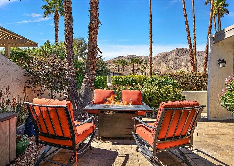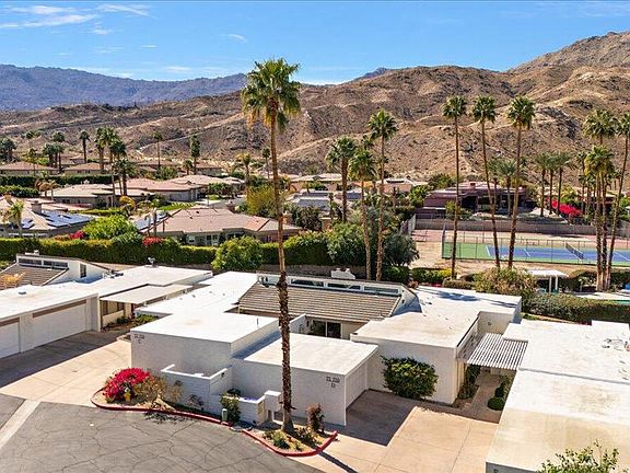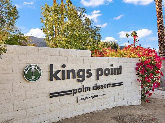 Step into your dream home in the heart of Palm Desert's sought-after mid-century modern neighborhood, designed by the iconic architect Hugh Kaptur. This beautifully maintained, with many upgrades, 3-bedroom, 2-bath condo is nestled in the historic Kings Point at Palm Desert community. It offers a rare Mills Act property tax reduction which conveys with the unit. Current owners are benefiting at a 40% reduction. Featured in Mid-Century Modern Week 2025, this architectural gem stands out as a true showpiece. The great room seamlessly opens to a south-facing patio, offering breathtaking views of the Santa Rosa Mountains - one of the best vistas in the neighborhood! Inside, the newly refinished fireplace adds warmth and character, while the kitchen with granite countertops is perfect for culinary enthusiasts. The dining area leads out to a private, spacious courtyard, ideal for outdoor dining and relaxation. The generous primary suite is complemented by a remodeled en-suite bathroom, the second bedroom opens to the South patio while the third bedroom enjoys its own private courtyard - a serene space for morning coffee or a peaceful escape. All three patios have been upgraded with elegant pavers for a refined outdoor experience. Recent updates include a newer water heater, upgraded windows, fresh interior and exterior paint, newer carpets in bedrooms, a fully remodeled primary bathroom, fireplace facelift, new pavers, and much more. The attached 2-car garage offers added convenience. Enjoy exclusive access to community amenities such as pools, spa, tennis, plus nearby hiking and biking trails. HOA includes Maintenance of the grounds and the roof (flat part excluded)Outside paint, access to teni scourt, 2 pools and a SPA.Just steps away from the world-class shopping and dining of El Paseo, experience the ultimate Palm Desert lifestyle in this one-of-a-kind masterpiece!