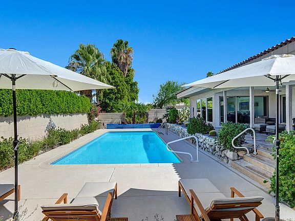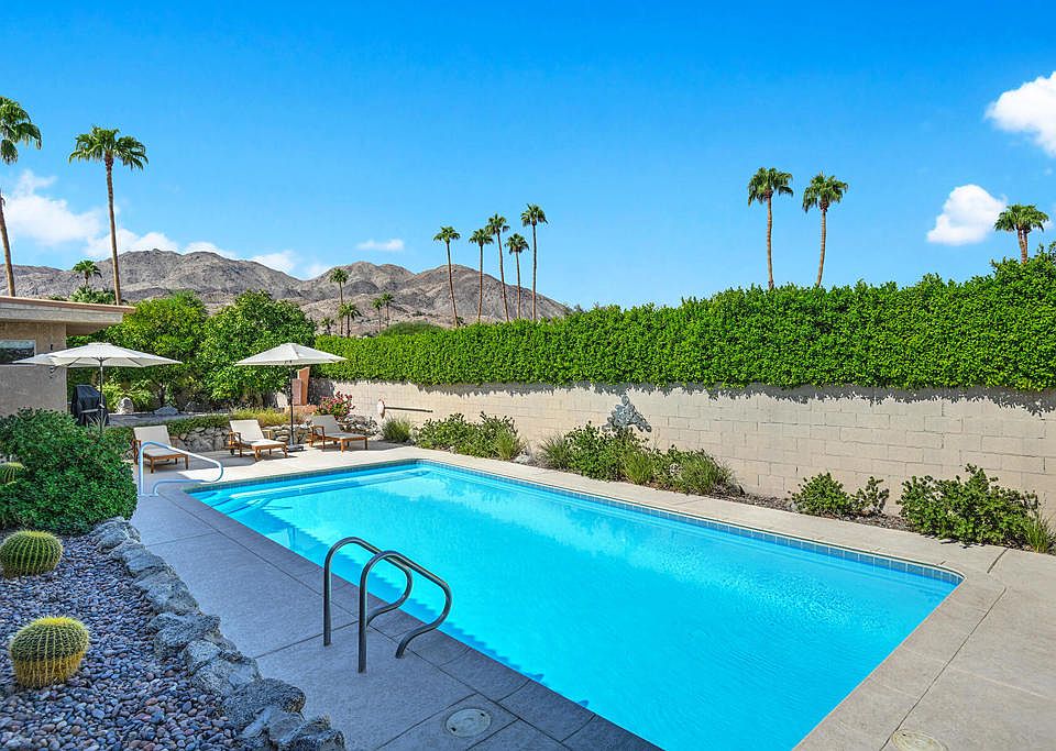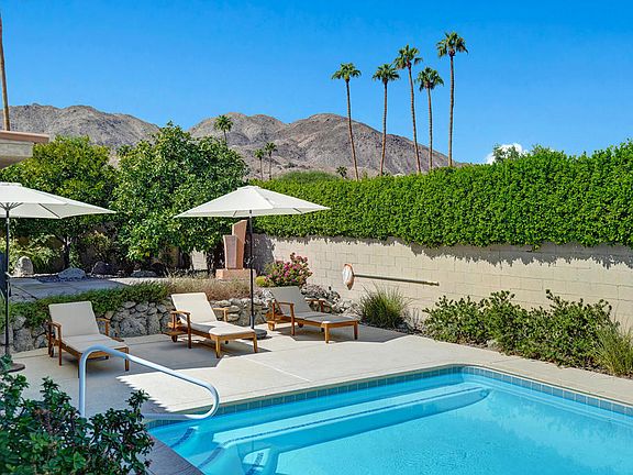 An exquisite South Desert retreat that seamlessly blends modern sophistication with timeless charm. This home is a sanctuary of comfort, boasting three spacious bedrooms and two and a half beautifully renovated bathrooms. The thoughtful 2019 updates include a contemporary kitchen and guest bathroom, along with new earthquake-safe premium windows and shades throughout. Step inside to discover a media room, where oversized windows perfectly frame the stunning mountain views, creating a serene backdrop for relaxation or entertainment. The primary suite boasts a walk-in closet, and offers a private patio complete with BBQ space where you can relax beneath the shade of mature citrus trees. The home's primary outdoor space features an expansive covered patio that was recently resurfaced ($45k enhancement) for year-round entertaining, and a large lap pool with ample lounging space for sun enthusiasts. The tastefully landscaped front yard offers a tranquil area to soak up the home's natural elements all set against the backdrop of Palm Desert's breathtaking scenery. Premium features include a water softener system, a reverse osmosis system, new ceiling fans, custom recessed canned lighting, new washer and dryer, new dishwasher and refrigerator. The home has solar installed, that is leased. This property, with its proximity to the vibrant El Paseo dining and shopping area, is a perfect choice for those seeking a luxurious primary or vacation home. Available fully furnished, turnkey!