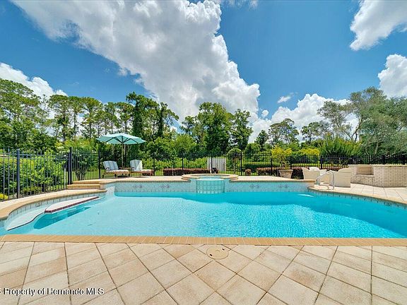 A HOME STRAIGHT OUT OF A FAIRYTALE. Set behind the GUARDED GATES of an exclusive community on a HALF-ACRE LOT WITH RIVER ACCESS, this professionally designed home enchants with high-end finishes and a CHEF'S KITCHEN so stunning, it feels like a dream come true. Set on a quiet cul-de-sac, this brick-front beauty offers 3 BEDROOMS plus an OFFICE, soaring ceilings, TRAVERTINE AND HARDWOOD FLOORS, and a HEATED POOL that feels more like a private boutique hotel escape than your own backyard. A brick paver CIRCULAR DRIVEWAY offers a warm welcome for guests, leading to a classic brick façade with columns flanking the front entry and a front porch overlooking a peaceful water feature and fountain. A second paver driveway leads to the side-entry garage, perfect for owners' everyday coming and going. Step into a grand foyer with soaring ceilings and travertine floors that set the stage for what's to come. The elevated formal living room makes a statement, while the formal dining room sits just beside it, both spaces glowing under gorgeous designer lighting. And then there's the kitchen—the true heart of this home and nothing short of spectacular. Completely renovated just a few years ago, it's a dream for anyone who loves to cook or entertain. SOLID WOOD CABINETS add classic beauty, paired with QUARTZ countertops that shimmer with timeless style. A custom hood crowns the WOLF GAS COOKTOP, while DOUBLE FRENCH OVENS stand ready for any grand gathering. There's a SUB-ZERO REFRIGERATOR, a wine refrigerator, and not just one full dishwasher, but also two dishwasher drawers to make cleanup feel like magic. And the TWO ISLANDS are impressively large, offering plenty of space for prepping, serving, or gathering with friends and family. The kitchen opens to the family room, where French doors lead out to the pool, and a GAS FIREPLACE WITH STONE SURROUND serves as the focal point. Just off the kitchen, there's also a small courtyard that brings a bit of the outdoors in. Ready to feel like royalty? The primary suite is fit for a princess, with hardwood floors and French doors that open to the lanai for a bit of morning sunshine or evening breezes. There are two roomy walk-in closets for all your wardrobe treasures. And wait until you see the bathroom—there's a soaking garden tub ,a walk-in shower that looks out to a SECRET GARDEN through a window, and beautiful hand-painted murals that bring the entire space to life. Just outside the primary bedroom, there's an office for work or quiet time. The split floor plan places two guest bedrooms on the opposite side of the home. One has an ensuite bath, while the other shares a bathroom that also doubles as the pool bath. Step outside, and the magic continues. A heated pool with a spillover SPA sparkles in the sun, while an OUTDOOR KITCHEN with a gas grill and bar seating is ready for gatherings. There's even an outdoor shower and a built-in open-flame grill. Beyond it all, the backyard feels like a hidden escape, with mature trees, lush greenery, and statues that add a touch of wonder. The property backs up to the WEEKI WACHEE RIVER, offering a beautiful natural backdrop. And living here means enjoying more than just the home—the community features a GUARDED GATE ENTRY, TENNIS AND BASKETBALL COURTS, and even a PRIVATE BEACH along the river. It's the kind of place that makes everyday life feel a little more special. NO CDD FEES AND NO FLOOD ZONE.