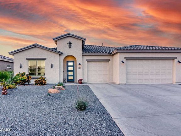 Breathtaking Superstition Mountain VIEWS!! This one year old, single story is better than new. Gorgeous backyard complete with extended patio, pergola, travertine, artificial turf, view fencing, hot tub and pool which backs greenbelt/wash area! Inside features include: oversized slider, two tone paint (Repose Gray), upgraded ceiling fans in all rooms (event he master bath), upgraded window coverings, custom mud/laundry room, custom desk/craft area and feature wall in great room. Extended 3 car garage with epoxy floors, built in cabinets and water softner. Room off entry can be used as a den, office or formal dining room. Also included is an air conditioned king size bed (frame only). Great open floorpan for those who like to entertain. Did I mention the VIEW! Showings begin May 7th.