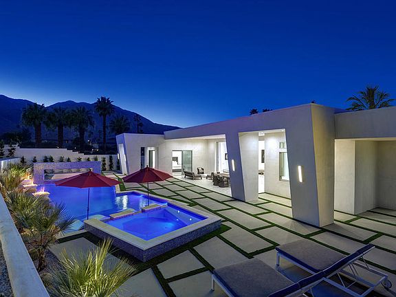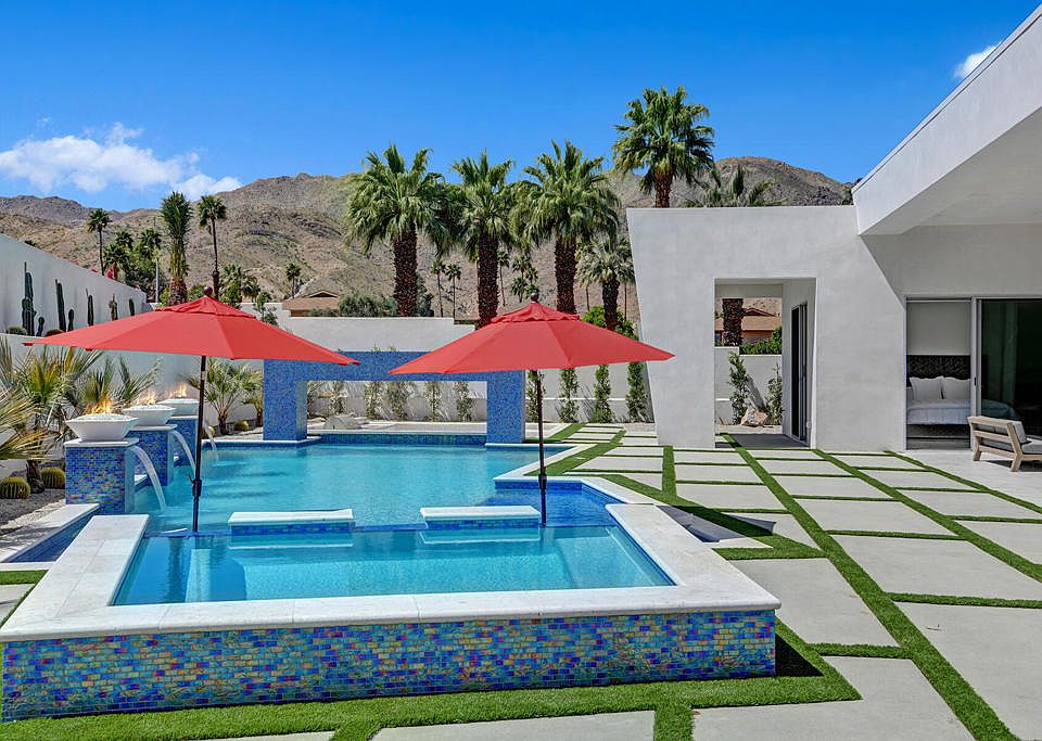 Experience your best desert vacations within this newly constructed vacation home in Palm Desert. Five ensuite bedrooms and 5.5 baths are featured in a grand single-level floorplan that encompasses up to 10 guests. Discover generous living areas, high ceilings, porcelain tile floors imported from Spain, quartz countertops throughout, tray ceiling designs, chic lighting fixtures, 4K HDTVs throughout, and breathtaking mountain views.A private oasis awaits out back, where an extraordinary pool reveals dramatic fire bowls, a tiled tanning shelf, and an in-pool bar with built-in stools for enjoying your favorite drinks by sun or moonlight. Four waterfalls include a state-of-the-art 15′ arched waterfall that outshines even the world's most high-end resorts. Beautifully landscaped grounds also display two covered patios.Warmed by a linear fireplace surrounded by mirror-matched stone, the great room flows seamlessly to the outdoors via disappearing pocket doors and directly into a fully stocked gourmet kitchen with glossy custom cabinetry, Miele appliances and an enormous island with seating.Floating cabinetry, a walk-in shower and stand-alone tub enrich a master suite that offers direct access to the backyard. Contemporary furnishings, state-of-the-art entertainment systems, and custom-crafted finishes dramatically elevate the home's luxurious ambiance.Located next to Palm Desert's exclusive El Paseo Shopping District, renowned as the Rodeo Drive of the desert.