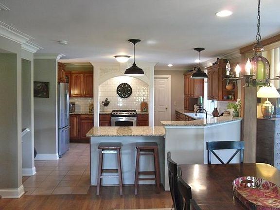 Slice of Heaven on 4.8 Acres. Pool parties, pergola swing by stocked pond, volleyball, privacy, woods, chicken house, farms nearby, 5 minutes to shopping. Updated 4242 SQ. FT., 4 bedroom, 3 full bath, 2 half bath, open plan, 4 car, rear garage/shop, LL rec room/kit/full bath, 1st floor office.