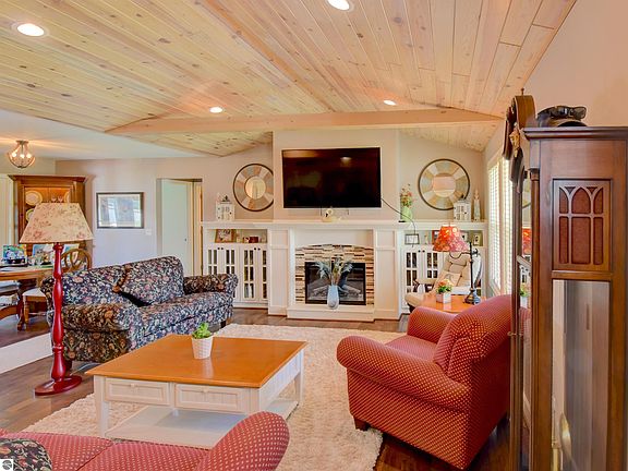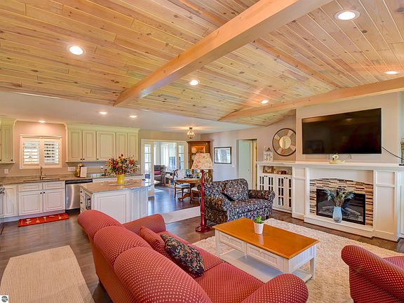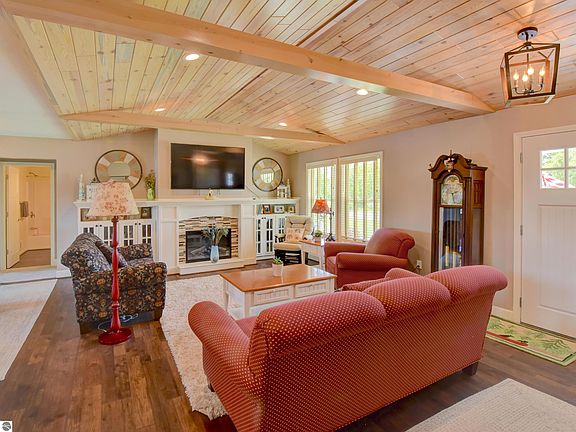 Back on the Market! Located on the highly desired peninsula neighborhood of St. George's Point, you will find this better than new, custom built craftsman style home with 117 feet of private level, frontage on Cedar Lake. From the moment you encounter of the covered front porch, to the grandeur of the soaring ceilings with with exposed trusses and shiplap, warm and inviting Timberlane laminate floors, and custom fireplace complete with stacked stone and thoughtfully designed built-ins, you will feel immediately at home. Dazzle your family and friends with your culinary skills in the massive, bright and airy kitchen with beautiful cabinets, and chef quality-stainless steel appliances, and granite countertops. Additional features of this quality built, and lovingly maintained home, include bright and airy spaces, architectural windows, storage beyond your greatest expectations, and glorious perennial gardens. Here are our thoughts... Rebecca's take: "I love the bonus spaces this home has to offer. The recreation room above the garage is the perfect flex space for a home gym, office, art or yoga studio." Kim's take: "I love homes that approach the indoor and outdoor living spaces with equal appreciation, and this home does that. From the expansive sunroom to the large deck that places this all sports lake front and center... this is the perfect place to entertain and enjoy all things Northern Michigan." This home truly checks all of your boxes.