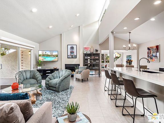 ***NEW PRICE...DON'T MISS YOUR CHANCE TO GRAB THIS FULLY RENOVATED CONDO***Designed by renowned architect Hugh Kaptur, a visionary of mid-century modern design, this fully renovated 2-bedroom, 2-bathroom condo is part of the historically designated Kings Point community. A true blend of timeless architecture and contemporary luxury, every detail has been thoughtfully reimagined, from brand-new windows and sliding doors to clean-line finishes throughout. Perfectly situated just minutes from El Paseo, this home strikes a balance between convenience and tranquility, offering easy access to shopping, dining, hiking trails, The Living Desert, and world-class golf courses. Inside the soaring cathedral ceilings, clerestory windows, and a fireplace define the spacious living room, creating a warm and inviting atmosphere. The sleek, open-concept kitchen features white quartz countertops, upgraded stainless steel appliances, and views of two expansive patios that extend from the living room and dining area, seamlessly blending indoor and outdoor living. A versatile space off the dining area, with two sets of sliding doors, offers endless possibilities perfect for a home office, den, or additional lounge. The primary suite serves as a luxurious retreat with a fully renovated bathroom featuring a double vanity, a glass-enclosed tiled shower, a soaking tub, and a generous walk-in closet. A private patio off the primary bedroom provides a peaceful outdoor escape. Stylish and comfortable, the second bedroom and bath offer equally refined accommodations. A generous-sized front courtyard with newer desertscape enhances curb appeal while providing a welcoming and low-maintenance outdoor space. The attached two-car garage features an epoxy floor, adding a polished and durable finish. Residents enjoy a resort-like lifestyle with two sparkling pools, tennis courts, and expansive greenbelt areas, all surrounded by breathtaking mountain views that enhance the community's serene and picturesque setting. Flawless renovation, iconic mid-century design, and an unbeatable location within one of the deserts celebrated architectural communities make this condo an exceptional find.
