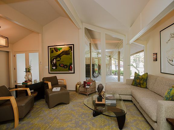 Contemporary in the trees, completely updated and remodeled, slate floors, vaulted ceilings, walls of windows, custom kitchen w/commercial range, double ovens w/warmer drawer, ice maker, wine, Vaulted master suite w/FPL, Pool, outdoor FPL & water feature