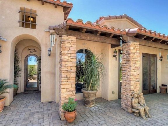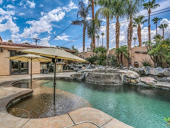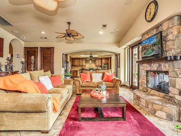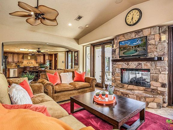 True resort Indoor/ Outdoor living. Exceptional Solar Power Tuscan home with authentic stone facade in the heart of Palm Desert. Enter through the game room to a sunken bar with stone fa~ade, the open Chef's kitchen, the sprawling living room with stacked stone has dual sided fire place. Main house offers two bedrooms with en-suite baths, an office & powder room. The luxury master suite includes fireplace, private entry to pool & spa, huge walk-in-closet. The guest bedroom has a private patio. Plus a private casita adds a third bed and bath. The custom outdoor kitchen / bar on the covered patio includes refrigerator, grill & rotisserie, a resort style 8 ft deep saltwater pool with "BEACH" entry for lounging and a Spa that cascades into the pool. It's lush and makes this a perfect resort getaway or full-time residence. Also Includes a HUGE 70Ft RV parking space, with it's own hook- up station & dump, plus both a 1 & 2 car garages. Enjoy nearby hiking or El Paseo's luxury shopping.