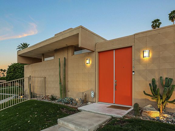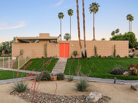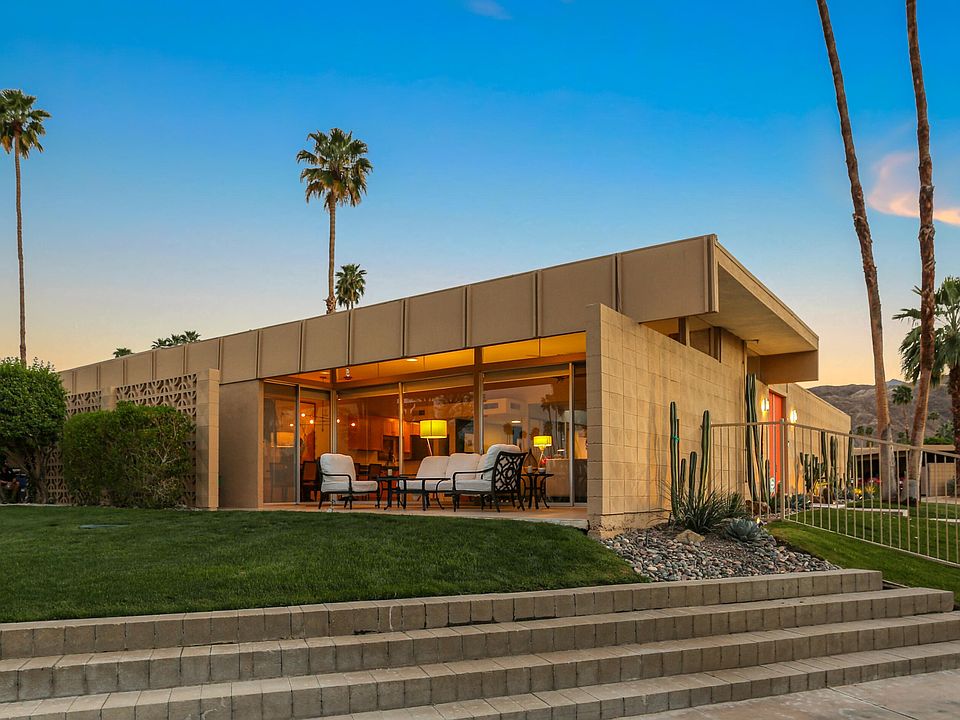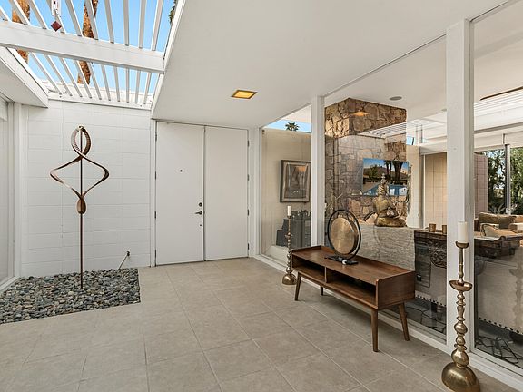 Amazing mid-century atrium model condo designed by Wm. Krisel! This 2 bedroom / 2 bath condo is located in the historical section of Sandpiper in Palm Desert. This is one of the most highly sought-after floorplans with all of the desired vintage features: walls of glass and sliding doors in the combined open floor plan of living room and dining area, exposed block walls, and clerestory windows. Entryway atrium is a private outdoor area with full views opening to entire living area as well as sliding glass opening to master bedroom providing maximum light to both areas. Kitchen has updated cabinets with quartz countertops along with stainless steel appliances. Both bedrooms have plenty of closet space and feature bathrooms which have been renovated with floor to ceiling tiled walk-in showers and modern plumbing features. Poolside patio features vintage shadow block wall with a northeastern exposure overlooking greenspace and pool area with northern mountain views. Includes leased solar panels and 1 garage space close to unit. All within walking distance to the El Paseo, shopping, dining and more!