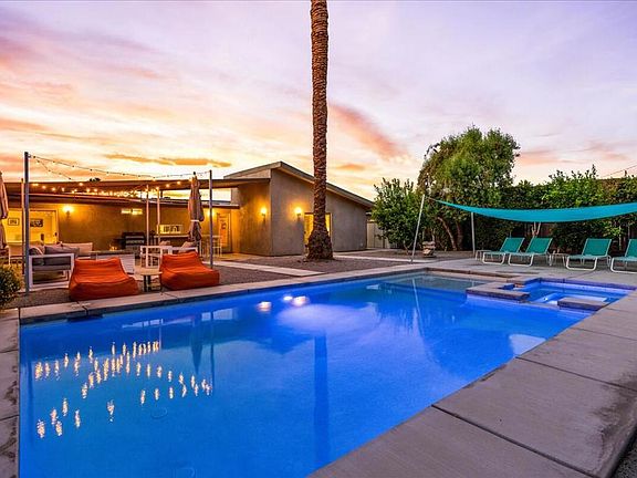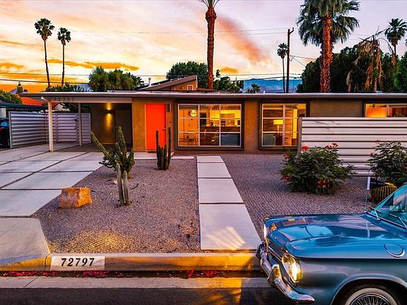 Discover an exceptional, fully renovated, 1957 Mid-Century Modern showplace! Own your own mid-mod designer decorated 'mini-estate' behind tall hedges and metal privacy fencing. Property combines modern comfort with vintage class! Furnished per inventory--just bring your toothbrush! Picturesque mountain views. Open, floor plan with vaulted post & beam ceilings--bright & contemporary retro feel. THREE bedrooms, two bath. Backyard set-up to entertain & enjoy. Saltwater pool & spa with shade structure, fire-pit, spacious covered patio with outside table bar & BBQ with built-in gas line. Low maintenance front/back desert landscape (with efficient irrigation & solar lighting) add to the appeal. Property updated for high efficiency with owned solar system, dual pane windows & doors, LED lighting and ductless A/C & heating systems. Laundry room has its own outdoor protected closet with extra storage. Updated features include: gourmet kitchen with quartz countertops, glass tile backsplash (& plenty of gorgeous cabinetry space); stack-stone tile accent wall; oversized tile flooring throughout; bathroom vanities, fixtures, glass & shower tile. Bedrooms with sliders to outdoors & built-in closet organizers. Primary suite on separate private wing. Exceptional attention to detail modernizing entire property--while showing respect to its mid-century architectural elements. Enjoy the gorgeous interior, lounge poolside, entertain, stargaze--this is the IDEAL renovated property to call HOME! Centrally located in the heart of Palm Desert, close to El Paseo Shopping & Dining District, Trader Joe's, Whole Foods, hiking trails, CV Link biking, dog park, McCallum Theater & more! Attached carport--ample driveway parking. PLUS no Homeowner association dues. Move-in ready. Stop searching & START living!