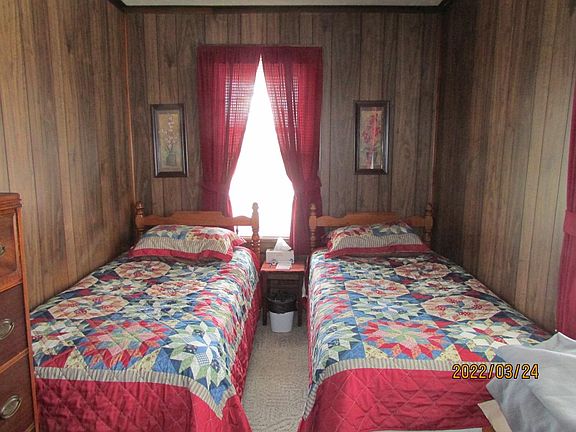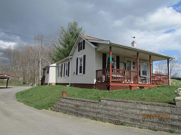 Unique setting in town but somewhat secluded. Well maintained 2 BR/1BA home. Nice covered front porch and back deck is also covered. 2 car block garage (24x24) set up to work on cars w/large carport on front. 24x24 pole barn in the back of property. Blacktop driveway and parking area.