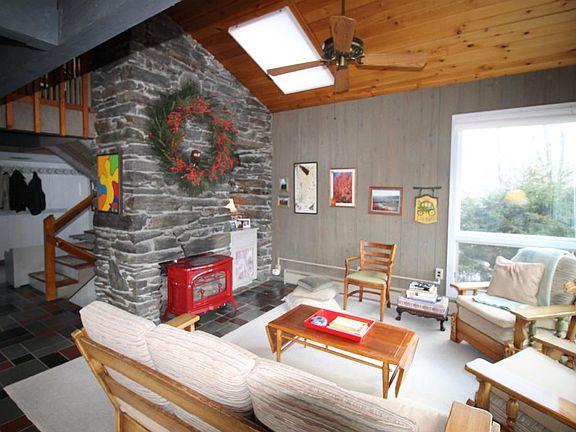 Extraordinarily well-maintained five-bedroom ski chalet directly across from the Sundowner ski trail, for ski in/ski out access. Built in 1970, this home has a surprisingly contemporary floor plan featuring a mudroom entry, an open kitchen, dining and living area, living room with vaulted knotty pine ceilings and a stunning floor to ceiling fieldstone fireplace with a brilliant red enamel Vermont Castings gas woodstove insert. The upper level features two bedrooms and a full bathroom, while the lower level offers three bunk rooms and a 3/4 bathroom with washer/dryer. Newer windows throughout, attractive exterior paint and a standing seam roof, for years of trouble-free living. With just a few updates, this delightful ski chalet will make a wonderful vacation getaway for anyone who loves to ski Pico.