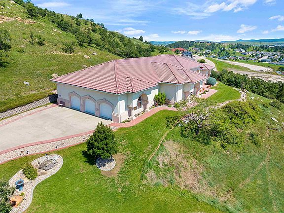 Listed by Marysia McDowall (605) 641-2500 RE/MAX In The Hills. This luxurious 3 bedroom, 3 full bathroom, 2 half bath home is stunning in its Spanish architecture with stucco exterior, tile roof with a modern interior. The view from the spacious front patio overlooks the majestic Black Hills including Crow Peak. As you walk past the pillars and in through the double doors you are enamored by the marble floors and 12 to 20 foot ceilings that lead to a sunken living room with a fireplace, arched windows and gorgeous wood floors. To the right of the entrance an office will be found that overlooks the patio and features a gas fireplace. The spacious master bedroom features a gas fireplace, built in shelving and access to a private patio that give this room a comfortable atmosphere. From the office make your way to the master bedroom which features an private bathroom with a new heated stone floor, jetted tub, walk-in shower, his and her separate sinks with a linen/storage closet, a private room for the toilet, and separate his and her walk-in closets. Next to the living area you will find the formal dining room with doors that lead to the back patio, and include a marble side bar. Follow the hallway to the cozy breakfast nook that also has doors that access views on the front patio. Walk into the breathtaking open layout of the kitchen, den and family room area.