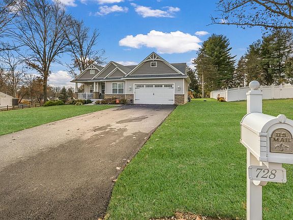 Welcome to this absolutely gorgeous custom-built 3-4 BR, 2.5 BA partial stone front Rancher in Casey Highlands. Covered front porch with custom lighting, custom front door leads to large entryway featuring gorgeous hardwood floors that continue throughout the entire home. Office off of entryway offers crown molding & ceiling fan. Large bright & airy Great room with crown molding, cathedral ceiling, ceiling fan, recessed lighting & custom stone propane fireplace with large mantle & built-in shelving on either side. Great room is open to gourmet Kitchen with huge center island with custom pendant lighting, stainless steel farmhouse sink, stainless-steel built-in dishwasher, wine fridge & breakfast bar with seating for 3. Beautiful shaker style cabinetry with custom molding, quartz countertops, custom tiled backsplash, pantry & stainless-steel appliances including gas range, built-in microwave, and wall oven. Large Dining room off of Kitchen with lots of windows letting in the sunshine. French door in Great room leads to 17 x 13 covered deck with ceiling fan, recessed lighting & custom built-in stone grill area with sink & bar seating. Steps lead from deck to paver patio and rear yard. Master Bedroom Suite offers custom molding, recessed lighting, 2 walk-in closets offering custom built-in shelving & storage. Large master bath with huge double vanity with quartz countertop, ceramic tile floor & large seamless glass shower with built-in seat & custom tiled floor & walls. 2 additional large bedrooms both offer custom molding, ceiling fans & recessed lighting. Full hall bath with ceramic tile floor, double vanity & tub/shower with ceramic tile surround & sliding glass door. First floor also offers a powder room & Laundry room with built-in cabinetry. Full, daylight walk-out basement.
