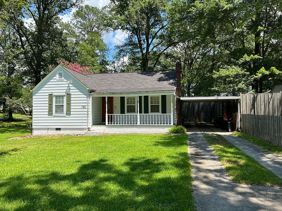 Check out this cute bungalow with a bonus sunroom or office area! Two full bedrooms with double closets, one bath and a bonus room. Added bonus is a spacious laundry room!! This home has laminate, carpet and ceramic tile floors. It features a large living room with decorative fireplace, kitchen is equipped with stainless refrigerator, stove and dishwasher. The exterior features and oversized covered carport, privacy fenced back yard and a double lot. Check it out before it is gone!