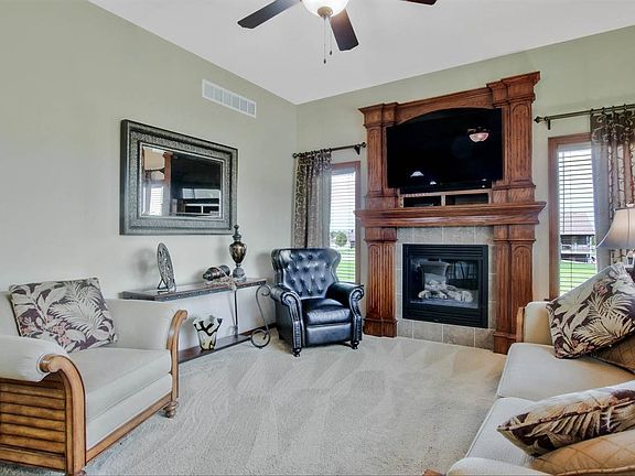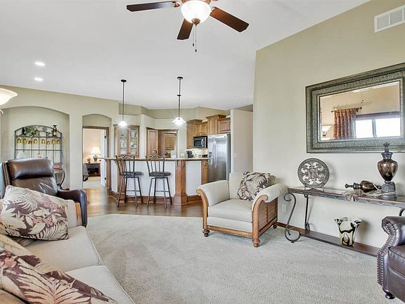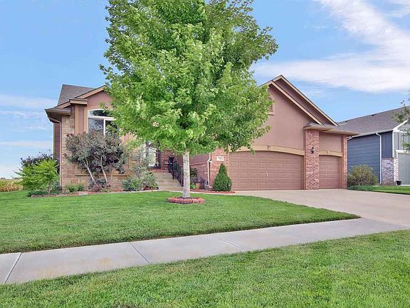 Lovely home in Sand Creek Station. 10' ceilings and open floor plan. Great room has beautifully detailed fireplace with TV/display niche above, large windows, kitchen island, walk-in pantry, granite counter tops, tiered plant shelves, wood floors in kitchen and dining. Split bedroom plan. Master bedroom with tray ceiling, cove molding w/ hidden lighting. Bath features double vanity, separate tub and shower, seasonal hanging walk-in closet. Back hall mud/laundry room has built-in bench and coat hooks. Basement finished with large rec room and full wet bar (beautiful!) 4th and 5th bedrooms, full bath and plenty of storage space. Gorgeous yard with sprinkler system, well, wrought iron fencing, private back yard, 12 x 12 enclosed porch for year round enjoyment and large patio area. Appreciate the beauty of living on one of the premier golf courses in the state. Located south of Newton, it's an easy commute, just 15 minutes North of Wichita. Close proximity to shopping, dining and Newton Medical Center.