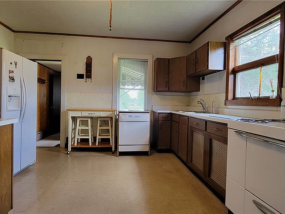 Situated on a nice corner lot with a detached garage and additional parking. Come make the interior into your own space. Multi use rooms throughout. First level has the kitchen with appliances, living room and an extra room that goes out into the front enclosed porch. Two more rooms off the kitchen and a small rear enclosed exit. Main Floor bathroom. Upstairs is a wide open area, two bedrooms and a previous 2nd bath that awaits your custom remodel. Full walk out basement level.