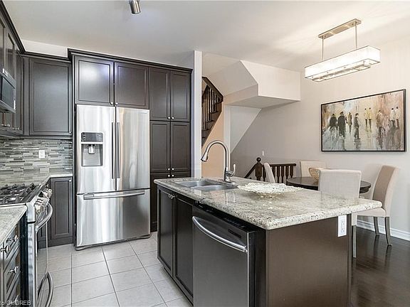 This lovely townhome with over 2,300sq ft of living space is located close to schools, parks, shopping, escarpment, hospital, Velodrome & more! An inviting porch and rare double door entry draws you into this beautiful townhome. The living/dining room has hardwood floors, 9ft ceilings, upgraded lighting and desirable gas fireplace that warms up this lovely space. The beautiful open concept eat-in kitchen is complete with stainless steel appliances [gas stove], eat-in island & garden door that leads you to the fully fenced yard with exposed aggregate patio. Bonus: Garage access direct to your own backyard & gas line hook up. Upstairs you will find 3 bright bedrooms. Relax and unwind after a long day in the spacious primary suite with large walk-in closet & 4pc ensuite [soaker tub/separate shower]. Even more, the finished basement is equipped for study, storage & play. Cozy berber carpet, cold cellar, laundry and tons of storage make up the ideal family lounge spot. Stop looking & make this home yours!