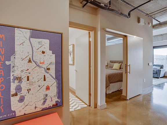 Stunning modern condo located in the North Loop of Minneapolis. This one bedroom unit is located on the corner of the building with a skyline view of Minneapolis. The loft style features an open kitchen/living area, with 2 flat screen TVs, breakfast nook/desk space with 2 chairs and a cozy fireplace, high ceilings, concrete floors, oversized windows with darkening shades and fully furnished. The bedroom offers a queen sized bed that is separated from the living room that has a sleeper sofa couch big enough for 2 guests, allowing 4 guests to sleep comfortably. The bathroom includes a rain fall shower, toilet, sink with provided toiletries, towels and hair dryer. The unit offers WiFi, heat and air conditioning along with one covered parking space. You will have access to the rooftop deck and members lounge on the main floor and concierge services from Minnestay. No binding lease terms, this unit can be rented daily for $140 a night.
