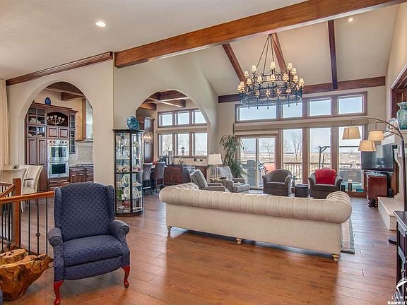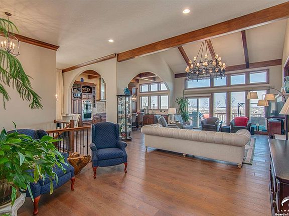 Fantastic custom-built sprawling ranch w/stunning 12 ft ceilings, wood beams, wood floors, open plan & upgraded finishes throughout. Gorgeous gourmet kitchen + island, granite, plentiful cabinetry, top of line appliances, dining room & family room enjoy floor to ceiling windows providing eastern skyline view. Hand cut stone fireplace doubles into main lvl master suite w/California closet + office w/bonus murphy bed. Walk out basement, custom theater room, large family room w/wet bar, wine room.