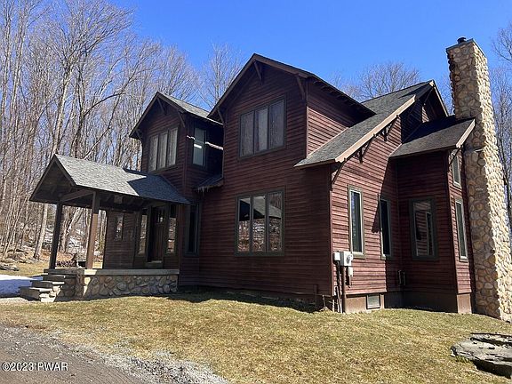 Beautiful contemporary styled home located on a 4.18 acre mostly wooded lot with winter time views of the lights at Elk Mt. Lovely hardwood floors, living room with cathedral ceilings and full fieldstone fireplace. Kitchen is updated with new appliances and concrete countertops. Large office with built ins perfect for work at home before hitting the slopes. The house has solar window shades, and blue stone stairs leading to the second level., Beds Description: 2+BED 2nd, Baths: 1/2 Bath Lev 1, Baths: 2 Bath Lev 2, Eating Area: Formal DN Room, Eating Area: Modern KT