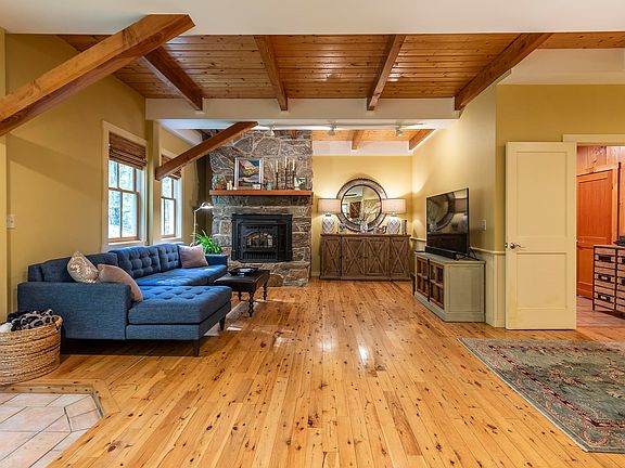 This beautiful Geobarn home blends timeless charm with modern, sustainable living. The open floor plan, with 9-foot ceilings, creates a sense of space, enhanced by radiant heat on the first floor and warm pine flooring throughout. A striking fieldstone fireplace anchors the cozy living area, perfect for relaxing on cold Vermont evenings. The oversized windows flood the home with natural light, offering stunning views of the surrounding nature. The spacious primary bedroom includes a large ensuite bath and a walk-in closet, while a custom laundry room provides added convenience. The home is thoughtfully designed for today's lifestyle with Geobarn’s signature focus on sustainability and simple elegance. Open-concept and light-filled, it provides flexible living and workspaces that can adapt to your needs over time. Outside, enjoy the peaceful sound of your own crystal-clear, winding brook that meanders through the property, adding to the serene atmosphere. An oversized two-car garage with a finished bonus room above offers extra space for guests or hobbies. Located just five minutes from the vibrant Woodstock Green, this home offers the perfect balance of privacy and proximity to local amenities, giving you the best of both worlds.