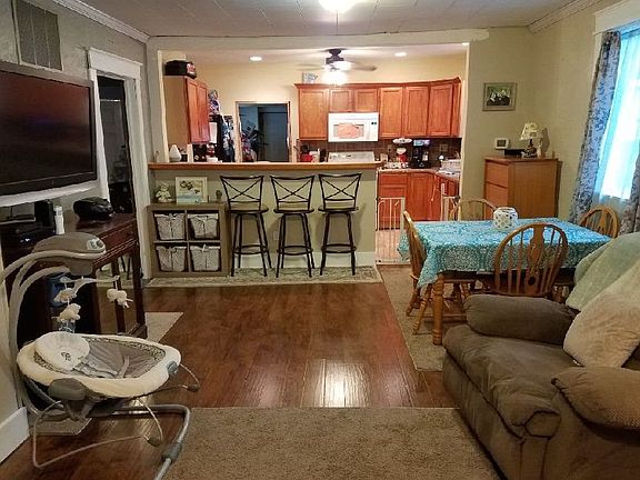 Beautiful bungalow with large living room, updated oak kitchen, 1 1/2 baths and nice covered porch for summer evenings. Windows 2010, roof 2006. Detached garage.