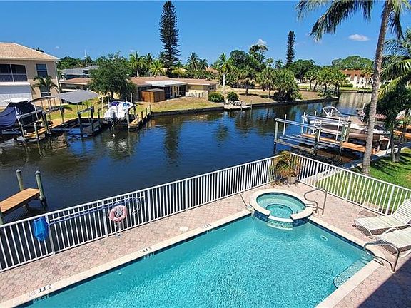 RARE OPPORTUNITY! Fantastic 3 BEDROOM, 2 bath condo with TWO CAR GARAGE overlooking INTERSECTING, DIRECT ACCESS CANALS! Has it's own, private wrap-around boat dock (new composite board) with BOAT LIFT & canopy (2020)! All four units in the complex were custom built! Short boat ride to the river with NO bridges or locks! Close proximity to the YACHT CLUB, restaurants, shopping, parks, & more! There are two additional parking spaces outside the garage! Wonderful, OPEN, great room floor plan with CATHEDRAL CEILING & quadruple set of sliders, & spacious rooms! Well maintained & professionally managed complex with HEATED POOL & spillover SPA, captain's walk, NEW TILE ROOF (2021), & paint/stucco sealing (2020)! This freshly painted unit has Hunter Douglas plantation shutters, NEW TILE FLOORS (2020), NEW A/C (2017), NEW APPLIANCES (2020), including WIFI refrigerator & air fryer range! Some furniture possibly negotiable. New garage organization & storage (2020)! Master suite has HUGE walk-in closet & access to screened lanai! Great storage in unit! Spiral staircase off lanai to pool/boat dock area! HOA has FULLY BUDGETED reserves, including seawall! Tax records shows as 2 bedrooms.