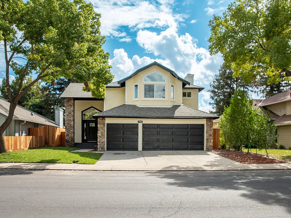 Elegant and fully renovated, this 3-bedroom, 2.5-bath residence is a harmonious blend of timeless design and modern sophistication. Thoughtfully curated finishes include two stunning electric fireplaces, quartz countertops, white cabinetry, and tile flooring throughout the kitchen and baths. All bathrooms are equipped with electric bidets, while the luxurious primary suite features dual vanities and a striking black soaking tub. An open-concept layout offers formal living, dining, and family rooms, highlighted by a grand open staircase and mirrored entryway. Outdoors, enjoy a private pool oasis, freshly laid sod with automated sprinklers, and a spacious 3-car garage. Upgrades include a new roof, stucco, windows, doors, paint, and serviced HVAC. A serene and sophisticated retreat, ready to elevate your lifestyle.