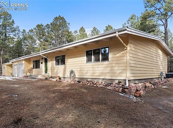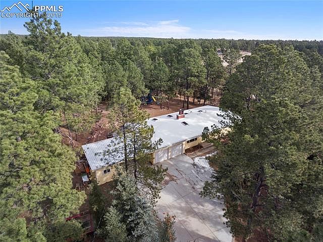 Close-in location in sought after SW Black Forest on over 3 acres of mature Blue Spruce, Fir and Ponderosa Pines! Remodeled midcentury modern rancher with all square footage on one level! Vaulted exposed wood beamed ceilings throughout entire home. Glowing hardwood floors throughout the majority of the main level. Spacious great room with large windows and a double sided wood fireplace. Freshly painted interior. Small barn/chicken coop. Detached workshop. Fenced garden area. Full size antique windmill. Spacious kitchen perfect for entertaining with butcher block counters, stylish penny floor, farmhouse sink, built-in grill with exhaust, metal accents and stainless appliances including a double oven and gas cook-top. Multiple skylights for additional natural light. Private location with very little traffic. Gorgeous fully treed lot with many types of various mature trees. Oversized master shower tiled in white subway tile and custom vanity with raised sink. New central air conditioning. Beautiful rear deck with built-in fire pit nestled in the trees for ultimate privacy. Root cellar. Zoned for horses. Invisible fence lines. Only 3.4 miles from Black Forest and Woodmen Road. Award winning School District 20! No HOA!