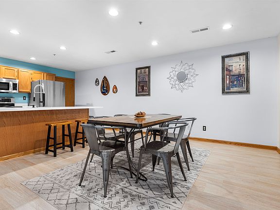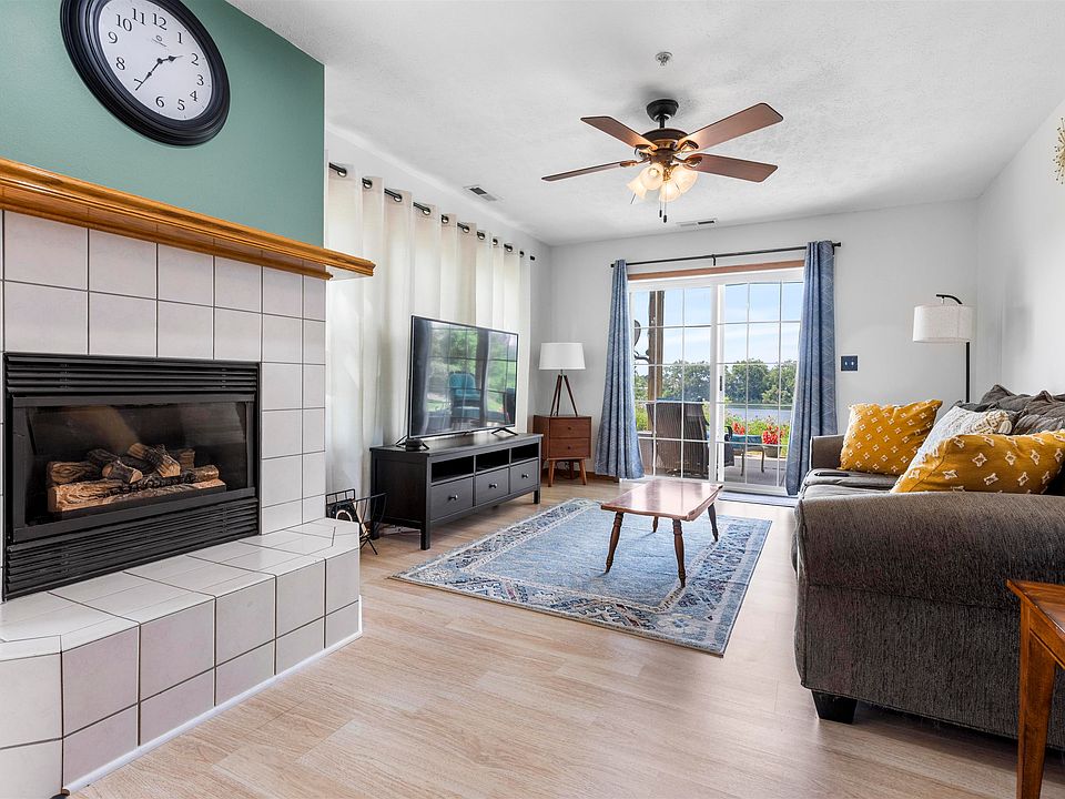 Stunning lake views form this cozy garden condo! This charming condo offers an open concept with 2 beds, 1 bath, cozy living room with a gas fireplace, dining room, spacious kitchen and a laundry room. Conveniently located close to eateries, shopping & entertainment. The roof, windows, and stainless appliances have recently been updated. The association fees cover snow removal, lawn care, garbage, sewer and water.