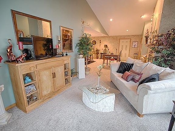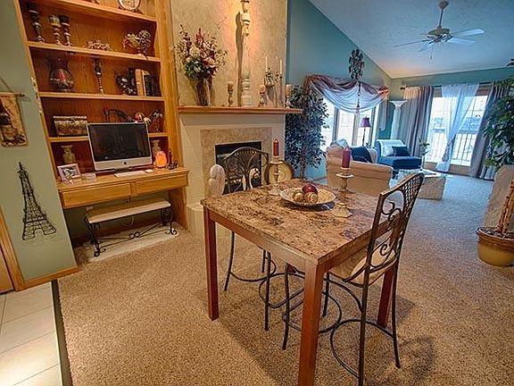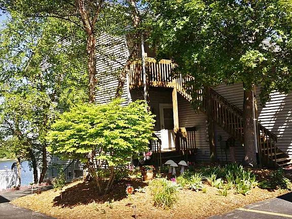 Beautiful lakeside condo with new flooring and freshly painted. Cozy fireplace with tile surround. Cathedral ceiling in Living room. Lots of windows and sunlight. Watch the sunset over the lake from your private deck. Two bedrooms very convenient to the hallway bath. The Kitchen has oak cabinets, neutral laminate countertops and a great breakfast bar for your morning coffee. Utility room off Kitchen with stackable washer and dryer. Stairway down to a 1.5 car garage. Plenty of parking area. HOA fees $115.00