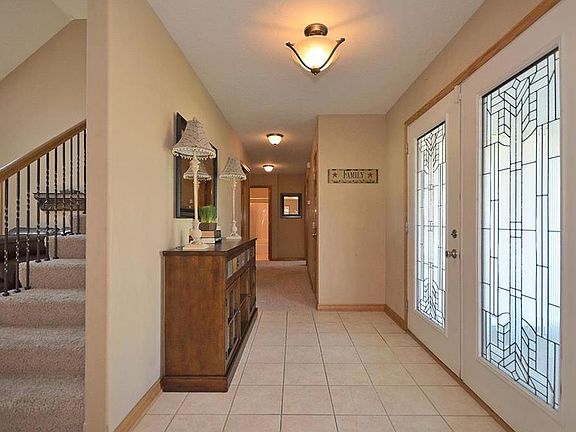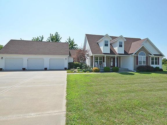 Picturesque 1.5 story home in Trimble, MO. Front porch, perfect for relaxing on warm summer nights. Foyer leading into living room with vaulted ceiling, skylights, stone fireplace and access to deck, kitchen with extra counter space, stained cabinets, breakfast room w/ bay windows and formal dining room. Spacious master bedroom w/ raised ceiling, spa-like master bath w/ jetted tub, standing shower and double vanity. Carpeted loft area, full unfinished walk-out basement and large deck. Clinton County R-III Schools!