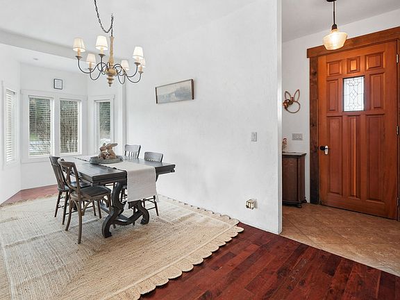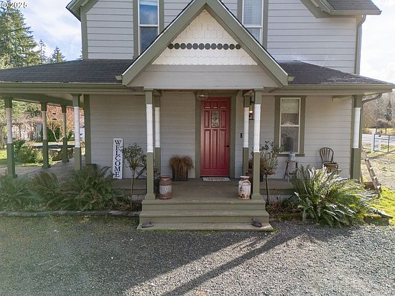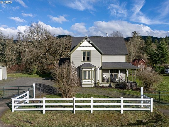 Welcome to 72807 London Rd!Nestled just 3 miles from Cottage Grove Lake, this beautifully updated home seamlessly blends rustic charm with modern convenience. Situated on 2 fully fenced and gated acres, this private retreat offers breathtaking natural surroundings and thoughtful upgrades throughout.Step inside to tall ceilings and abundant natural light that create an airy, inviting atmosphere. The custom kitchen is a chef’s dream, featuring brand-new smart appliances, cultured quartz countertops, custom cabinetry, a pot filler, and elegant lighting. The warmth of Brazilian cherry hardwood floors, tile accents, and bay windows enhances the home’s character. Cozy up by the Tulikivi soapstone wood stove, or enjoy the heated bathroom floor for a touch of luxury. A heat pump ensures year-round comfort.Upstairs, you'll find three spacious bedrooms, a convenient stackable washer & dryer, and a large bathroom with a walk-in shower. The expansive primary suite boasts a spacious walk-in closet, while the original stairs and upstairs floors preserve the home’s historic charm.Outside, the wrap-around deck provides ample space to relax and take in the serene surroundings. The property features Coast Fork Willamette River frontage, a fenced garden with raised beds, mature fruit trees, an ancient walnut tree, and vibrant flower beds. The backyard is an entertainer’s dream, complete with a fire pit, hot tub, and a pond with a waterfall—perfect for hosting gatherings.Additional structures include a finished studio shed (potential ADU), a second storage shed with a small livestock lean-to, a large shop, a new barn/shed, a chicken coop, and a dog kennel—ideal for a hobby farm or small agricultural setup.With updated plumbing, wiring, and new toilets, this home was renovated from the studs up by the previous owner, ensuring a solid foundation for years to come.Don't miss out on the chance to tour this one-of-a-kind property!