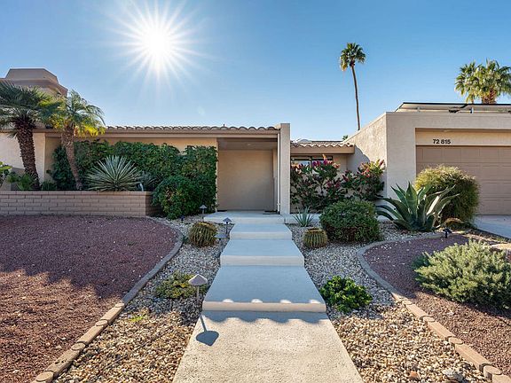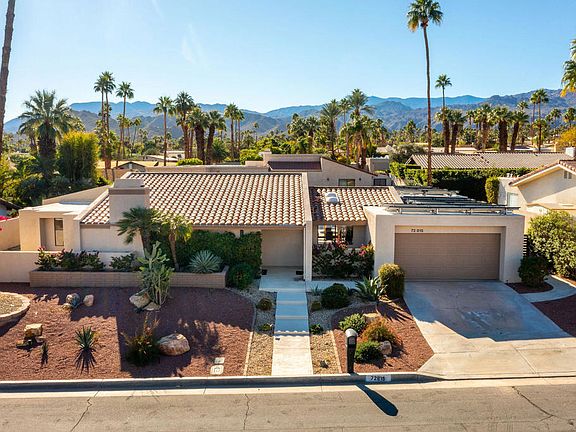 An exceptional South Palm Desert residence, fully reimagined through a complete down-to-the-studs renovation in 2021, offering refined desert living with modern systems, thoughtful design, and owned solar--all in a desirable non-HOA setting. This south-facing home was entirely rebuilt to today's standards, including new interior walls, ceilings, flooring, roof, fireplace, appliances, hot water heaters, and a new garage door and opener, resulting in a property that lives with the ease and confidence of newer construction. Expansive living spaces are filled with natural light and defined by soaring ceilings and exposed beams, creating a sense of volume and architectural interest. The custom kitchen serves as the centerpiece of the home, featuring a large granite island with seating, a commercial-style gas range, and seamless flow to the surrounding entertaining areas. A built-in wet bar with beverage and wine coolers enhances both daily living and hosting. Outdoors, the private backyard offers a resort-style experience with a striking glass-tile pool and spa, expansive imported travertine decking, and a gazebo perfectly positioned to enjoy mountain vistas and dramatic desert sunsets. The primary suite is a true retreat with direct access to the backyard and a spa-inspired ensuite bath complete with a standalone soaking tub and walk-in closet. Two additional guest suites each feature their own ensuite baths, providing comfort and privacy for guests or extended stays. Porcelain tile flooring runs throughout the home for a clean, cohesive aesthetic and easy maintenance. Owned solar, installed in late 2021, delivers outstanding energy efficiency and meaningful long-term savings. Surrounded by low-maintenance desert landscaping and ideally located near El Paseo's renowned shopping, dining, golf, and hiking, this home offers a rare blend of luxury, privacy, and modern desert sophistication.