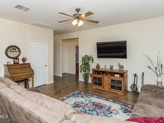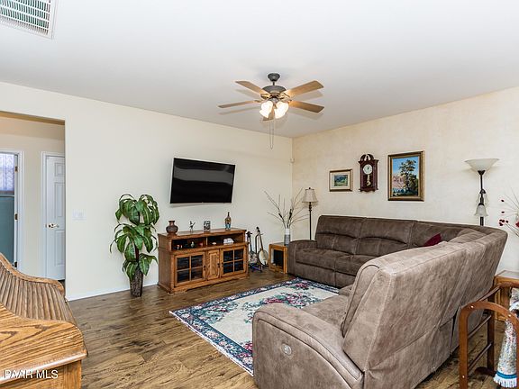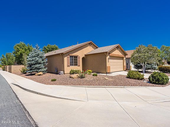 Located on a prime corner lot in the beautiful viewpoint subdivision of Prescott Valley, this updated home boasts amazing curb appeal with its mature landscaping in both front and rear! The open and spacious split bedroom floor plan with a great room concept provides single level living plus recent major updates include the water heater (2021) & HVAC (2020)! The interior features include raised panel interior doors, a neutral paint scheme, horizontal wood blinds, ceiling fans throughout & updated wood laminate flooring in 2019. Tile & wood laminate flooring encompasses the majority of the home with carpet only in the bedrooms. The elegant kitchen offers stainless steel appliances including a four-burner gas range, gorgeous oak cabinetry with crown molding and CONTINUE low maintenance solid surface countertops. The sizable master suite overlooks the beautifully landscaped backyard and offers a spacious walk-in closet. The on-suite bathroom has a raised height dual vanity, tub/shower combo, and private water closet. Both guest bedrooms are generously sized and have a handy linen closet between them. Both are serviced by a full bath with a comfort height toilet. The laundry room also serves as a mudroom coming in from the garage and has upper storage cabinets. The two-car garage is outfitted with built-in storage including racks/pegboards for additional organization options. The backyard has a covered patio with a flagstone extension and is fully fenced to provide ultimate privacy. The grass area and raised garden beds are both on a water-wise irrigation system.