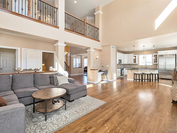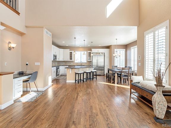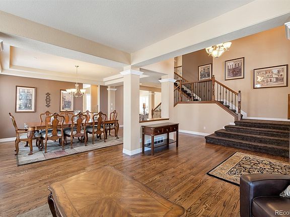 Incredible home in the Winter Berry community of Castle Pines North offers upgrades, details, & finishes throughout. This 5-bedroom, 5-bath home has almost 5,200 SQFT of living space, a wonderful layout, new paint on the first & second floors, hardwood floors, plantation shutters, plentiful windows letting in lots of sunshine, & concrete patio and raised garden for enjoying the outdoors.Formal dining room offers coffered ceilings, The large butlers pantry with beautiful cabinetry & granite countertop connects the dining room to the remodeled kitchen. The open kitchen faces the eating space and Family Room area. Enjoy plentiful custom cabinetry, slab granite counters with tile backsplash, center island with seating, stainless steel appliances including a microwave, dishwasher, oven & built-in refrigerator. Kitchen also features a study desk in kitchen. Beautiful stone hearth, gas fireplace & a wall of windows with plantation shutters, Upstairs, the master suite is tucked away from the secondary bedrooms to offer privacy. The bedroom with a 5-piece bath is filled with a ton of natural sunlight and walk-in closet. Built in TV will Stay! 3 additional beds upstairs featuring a Jack & Jill bath and a private full bath as well. Downstairs you will find your perfect entertaining space with a custom-built bar area offering refrigerator and space for gaming tables. Exercise room with padded floor wall mounted TV. The outside is excellent with a large patio, professionally landscaped yard & garden bed. Enjoy having Daniels Park, shopping & many trails nearby for hiking & biking.