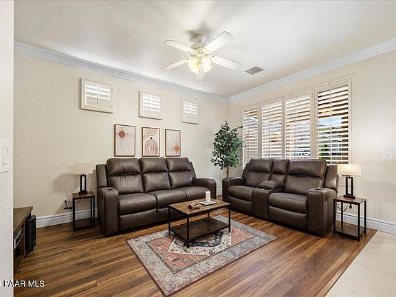Pride of ownership shines throughout this adorable 2 bedroom, 2 bathroom home in the highly desirable Stoneridge neighborhood! Step inside to a meticulously clean and inviting space, where the open-concept floor plan maximizes both comfort and style. Every detail has been thoughtfully upgraded, including elegant crown molding in every room, oversized baseboards that add a touch of sophistication throughout the home. The spacious primary bathroom and guest bathroom each feature beautiful upgraded shower doors to enhance the function of the walk in showers. The guest bedroom has its own ensuite entrance to the guest bathroom while also having a door to the main living space to serve as the main living area guest bath as well.
