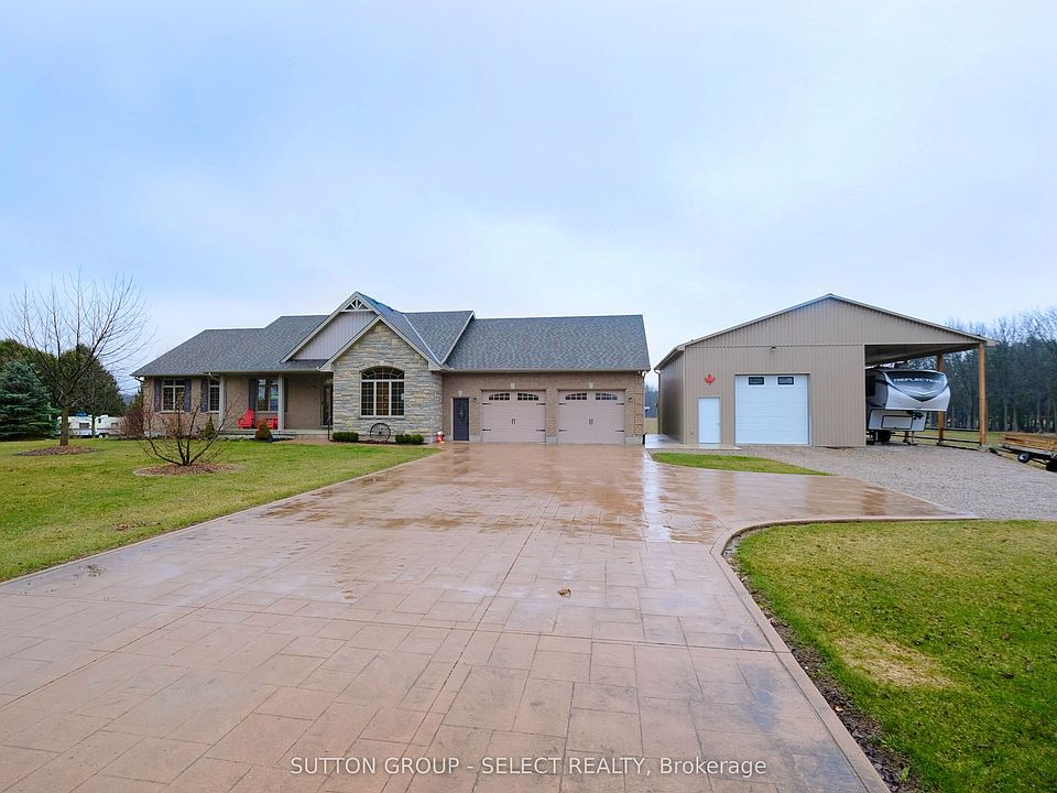 Come see this wonderfully large, 3+1 bedroom home on a beautiful rural lot. When you walk in you will be amazed by the open concept Great Room with the classic oak cabinets in the kitchen, hard wood and in floor heated ceramic floors, and oak trim and doors throughout. The kitchen has modern appliances with a gas range, a large island, a bay window looking back to the fields, Granite counter tops, and high end finishes. The Great Room is a bright and happy place where you can enjoy cooking, entertaining or simply relaxing. A laundry room and 3 bedrooms make up the rest of the main floor. All of the rooms are large and comfortable making this the perfect family home. The master bedroom has a large walk in closet and ensuite with Jacuzzi Tub and shower. The lower level boasts a large open concept area that could serve as a family/recreation room, along with another bedroom, full bath and a large utility/storage room. It may be the perfect crafters getaway or an in house storage or workshop. The attached two car, oversized, garage for the vehicles is complimented by a 38x24 ft accessory build (shop) with a workshop in the front, and a high end swim spa in the back and a loft for more storage. The spa is a heated 14'x8' Swim Spa that can be used as a hot tub or set the flow rate and swim away. Along the side of the shop is a carport to house the RV, boat or other large vehicles that make life worth living. The shop is fully insulated and has in floor heating. The property is minutes from Strathroy and all of the services you require including a Walmart, Canadian Tire, Super Store, building supplies, churches, schools, car dealerships, a vibrant main Street with shops and restaurants and the list goes on. This place is spotless and move in ready and is just waiting for you to come and discover the beauty and functionality of this fantastic property.