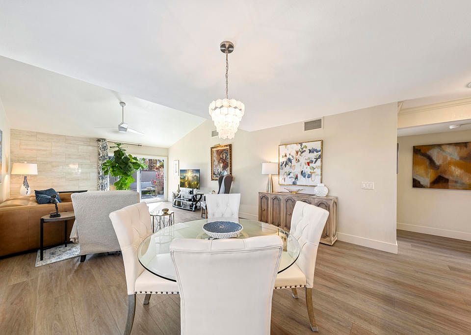 One of the best kept secrets in Palm Desert. Discover this hidden gem at Monterey Sands. There are fifty units in the complex and you own the land on this property. (FEE SIMPLE) This 2 bed 2 bath condo has been professionally upgraded by the current owner. This is an end unit of 1223 sq. feet. Ah open floor plan includes a large living room and fireplace, vaulted ceilings, direct access to the south facing patio and back yard. The dining room and kitchen feature abundant storage and lovely view of the courtyard. Both bedrooms have ample closet space, and the master suite features direct access to the patio,as well as a large en-suite bathroom with dual vanities, soaking tub and separate shower. The home also has a two car covered garage. The location is a short walk to Trader Joe's ,Whole foods. You can head south on Monterey and be in the heart of El Paseo. If you want to take some courses it is also a short walk to College of the Desert. The facility also includes tennis courts,pickle ball and two swimming pools.
