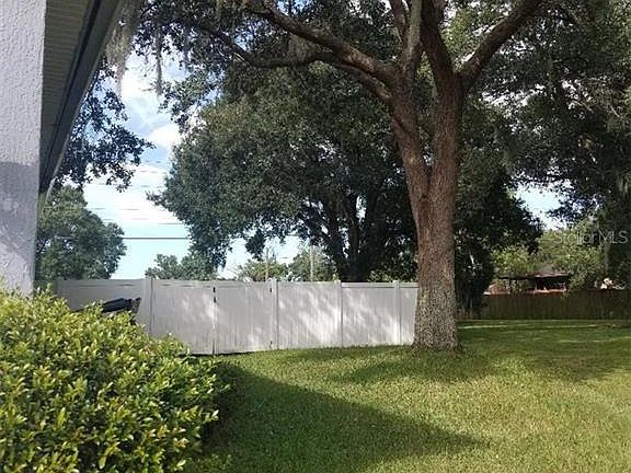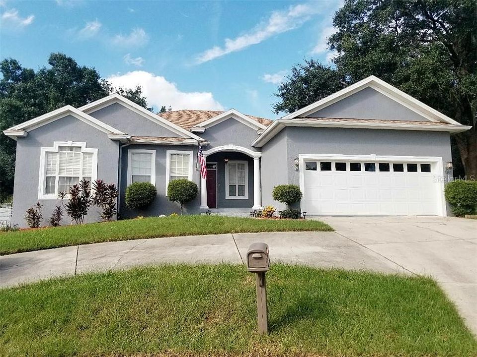 This striking property includes a circular driveway, leading uphill to a well-maintained home, which is located on nearly 1/2 an acre! Tall, dramatic columns stand on each side of the covered porch. Immediately upon entering the home, you're likely to notice the wide-open, comforting layout of the tiled great room, w 2 sets of sliding glass doors, in addition to the connecting formal dining area, which has attractive faux wood laminate flooring. The 2 (additional) columns surrounding the formal dining space, along w crown molding located in the majority of the home, add elegance & interesting detail. A set of French doors open up to the XL master bdrm, where you'll find another set of sliders overlooking the back porch/yard. This 3rd slider allows you the option of letting in lots of sunlight, or blocking it out w the included blackout curtains. The master bathroom has a garden tub, separate shower, private toilet room, & XL walk-in closet measuring approx 7.41' x 8.75', believe it or not! There is a beautiful wall fixture for shedding lots of light over the sizeable counter & 2 sinks. This distinctive bathroom even has a door for direct access to the HUGE screened porch, measuring approx 8' x 40'! The porch overlooks an ENORMOUS fenced back yard, providing space & privacy, w/o back door neighbors. It's not difficult to imagine yourself entertaining guests here, or simply relaxing, as 2 overhead porch fans (w lights) help keep you cooler. Indoors, there's an impressive kitchen consisting of custom, upgraded cabinetry built by Merillat. All of the lower cabinets have slide-out shelves that will make you wonder how you ever lived w/o them. The center island not only provides extra counter space, but also has cabinets underneath. You'll have a choice of enjoying meals at the long breakfast bar, or in the corner nook, or if you prefer, in the formal dining area -- which can alternatively be used as a sitting area. All included appliances are like-new & a dark stainless steel color. Built between the kitchen & garage, there is a versatile & unique room measuring approx 6' x 13'. This space has a small window to let the sunlight in, & can be used to best fit your individual needs, whether that be a walk-in pantry, extra storage, or even an office or playroom. You'll find washer & dryer hook-ups in the garage, w more cabinets affixed to the wall above, for storage of detergents. The hallway leading to the 2nd bthrm, as well as bdrms 2 & 3, incorporates a built-in desk that's nearly 5' long, & 2' wide (not including the pull-out keyboard shelf.) There are 4 (more) ceiling fans throughout the home's interior, which may help reduce the need for running the air conditioner, possibly keeping more $$ in your pocket w lower electric bills. Speaking of saving $$... Think of all the $$ you could spare on low HOA annual dues, which currently break down to a mere $16 per month. Last, but not least, let's talk location: This property is situated just 1/2 a mile from the Kathleen Square Shopping Center, which currently houses a Publix supermarket, w a nearby convenience store for refueling your vehicle w/o the hassle of driving out of your way. If convenience, flexible space, elegance, uniqueness, natural light, & an enormous private back yard are attributes that appeal to you, put this property at the top of your 'must see' list right away. Once you visit in person & fall in love, plz include a letter of financing pre-approval with your as-is offer.
