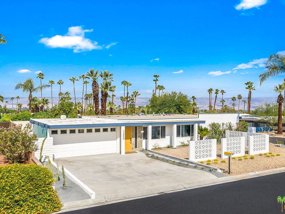 Live the good life in this completely redesigned South Palm Desert mid-century VIEW home. Located on an oversized corner lot with period breezeblock walls, you will immediately feel a sense of fun when you walk through the front door. The groovy Malm fireplace in the family room, sputnik chandelier and turquoise range transport you to the grand era of Palm Springs. Perfect for entertaining, enjoy the open and bright feel of this retro home with peanut shaped pool, covered patio, outdoor shower and conversation fireplace. The million dollar VIEWS are so fabulous, you'll want to sit back, soak up the sun and enjoy evening sunsets over the mountains. Bright primary suite with coffee bar, oversized walk in closet and bonus yoga studio/office/lounge space. Kitchen features sleek waterfall "terrazo" style countertops, all new appliances and high gloss cabinetry. An easy golf cart cruise down to El Paseo for world class dining, art and shopping. Close proximity to National Parks, hikes, great schools and more. This neighborhood is the desert's best kept secret!