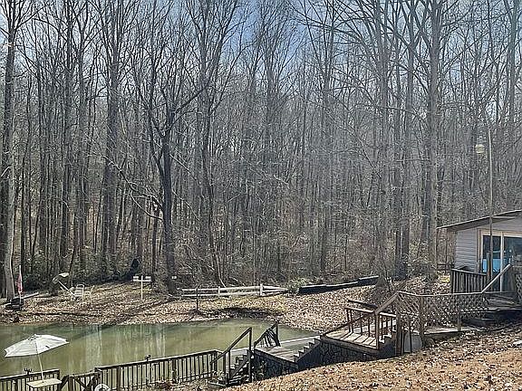 Three bedroom two bath mobile home with detached garage and fishing pond.