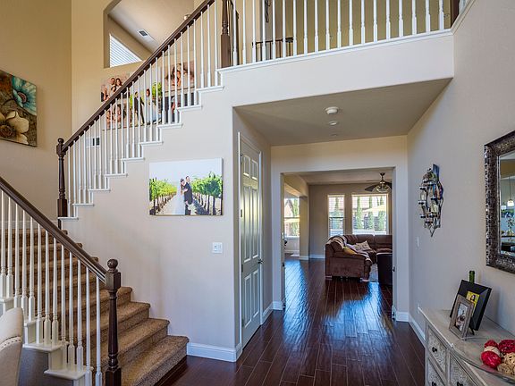 Located in a private cul-de-sac, this Granville La Mirada solar home features 5 bedrooms, 3.5 bathrooms and a 3 car garage with utility sink. Guests are greeted with soaring double height ceilings in the entry and dining room. Note the designer lighting and upgraded wood tile flooring as you walk throughout the home. The master suite includes a soaking tub and a balcony overlooking the pool creating a retreat-like experience. Three additional bedrooms, a loft and space for a home office round out the top floor. Back downstairs, be sure to check out the spacious kitchen with granite countertops, stainless steel appliances and a breakfast bar, family room with a Heat-N-Glo Cosmo modern fireplace and built-in shelving, crown molding and a guest suite for those that prefer ground floor living. The backyard is an entertainers paradise featuring a pebble tec pool with 3 waterfalls, fire pit with built-in seating and an oversized pergola.