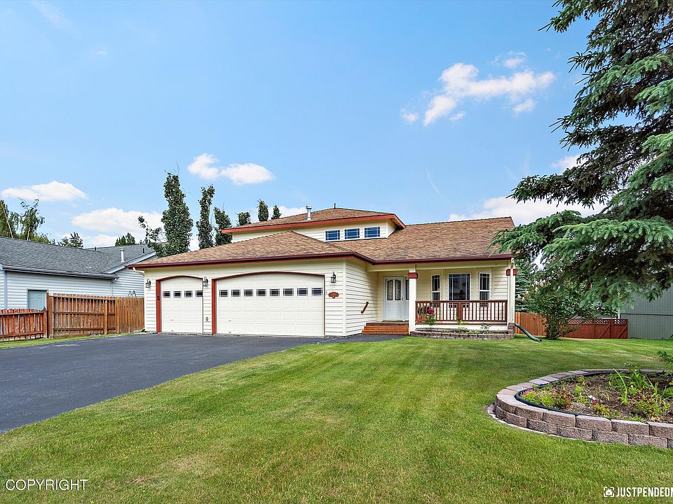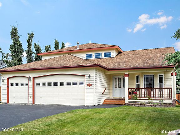 Lives like a RANCH. Open concept w/mstr suite on main floor including laundry room, PLUS an office! Gas F/P & Crown molding add charm. 3 X-large bedrooms up. Kitchen offers newer appliances, gas stove & granite countertops. Large bar for entertaining. Custom shed & numerous flower gardens. Walk out the door to skiing, hiking, biking, and all Kincaid Park has to offer. Large 3-car gar & RV parking