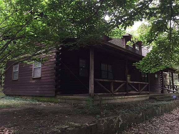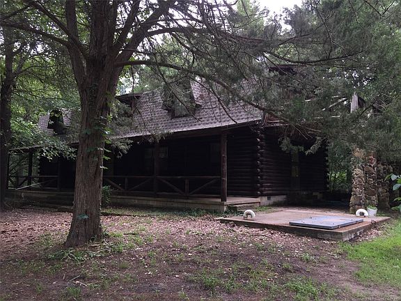 Rustic beauty! 2-Story log house with 3 bedrooms, 3 full baths, huge living room and nice kitchen with new appliances and lots of cabinets. Looking for that secluded get-a-way - this is it! Lots of trees surround this home with views of the spring-fed pond, 2 creeks - one with a beautiful waterfall and swimming hole! Watch the wildlife from the covered front porch, side covered patio or the upstairs balcony. Huge detached garage and a nice barn in the front meadow.